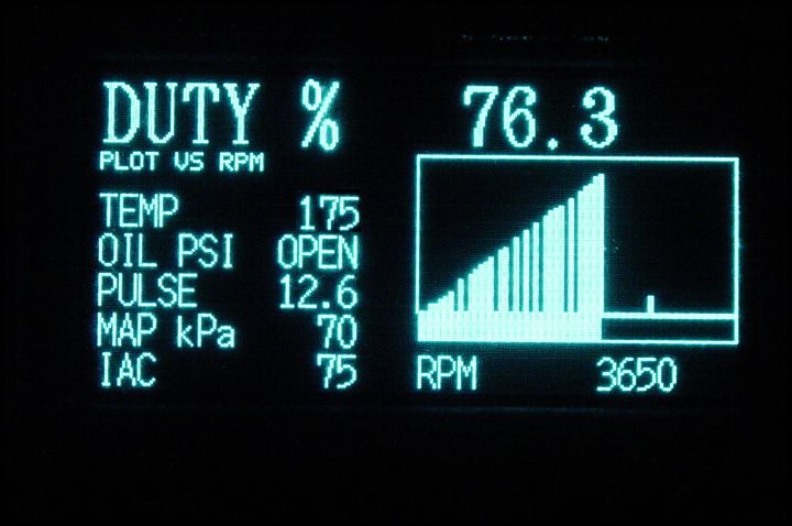 This screen shows a plot of sensor values vs RPM. The RPM is plotted on the X axis while user defined sensor (Injector Duty Cycle) is plotted on the Y axis in real time. As RPM increases from left to right, the measured sensor value is plotted as relative amplitude. New values overwrite old values for the same RPM but are “frozen” once the RPM move on to another cell thus creating a history. The graph has 64 RPM cells from 0 to 7000 RPM. The graph can be cleared by selecting a new screen. Additional sensor values are shown on the left. This plot can be generated for MAP, SPARK, PULSE WIDTH, or any other user defined input. Sensor values come from C950 via serial port.