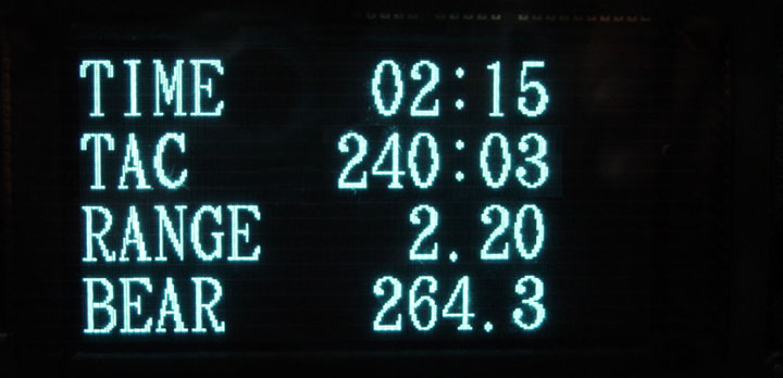 Shows 4 NMEA inputs in Large Text format. TIME is UTC time adjusted for local time zone from GPS receiver. TAC is hour tachometer display when engine is running. RANGE is distance to waypoint from GPS receiver. BEAR is bearing to waypoint from GPS receiver. NMEA inputs come from serial ports. All inputs update in real time. Display labels and positions are user programmable.