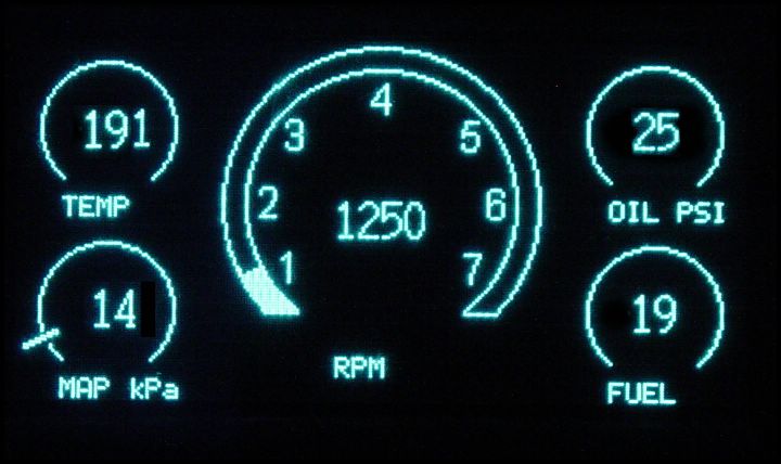 This screen shows 5 gauges in graphic dial format, Each gauge has a pointer that rotates clockwise as values increase. Large RPM dial fills clockwise as value increases. Temperature and MAP values come from C950 via serial port while OIL and FUEL are analog inputs. Dial positions and labels are user configurable.